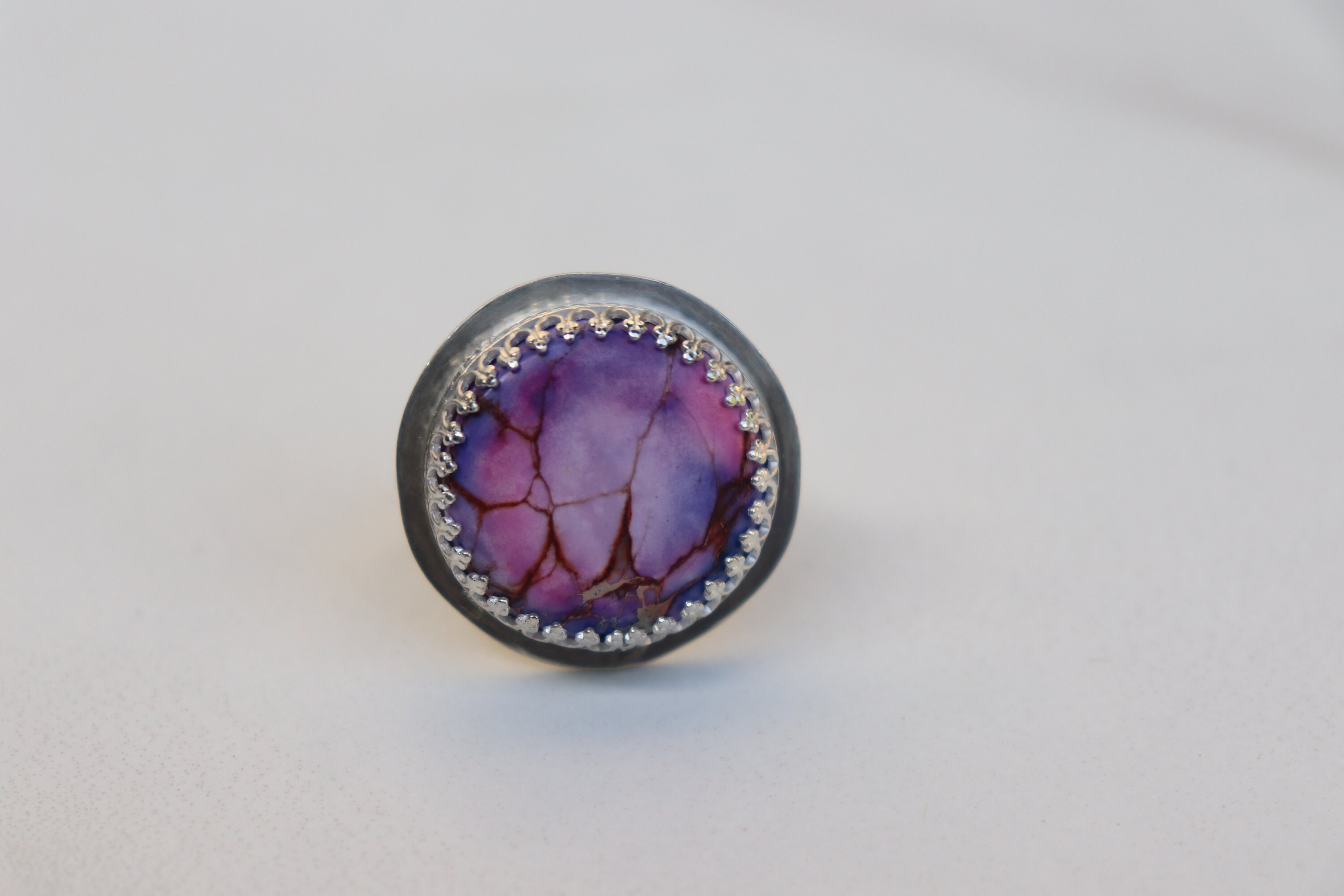 100% Hand made. One of a kind. Heavy sterling silver hand made setting with 12.25 ct agate from Mexico. Set stone diameter measures 20mm. American size 8.Watch my process on Instagram @sarapancakesjewelry