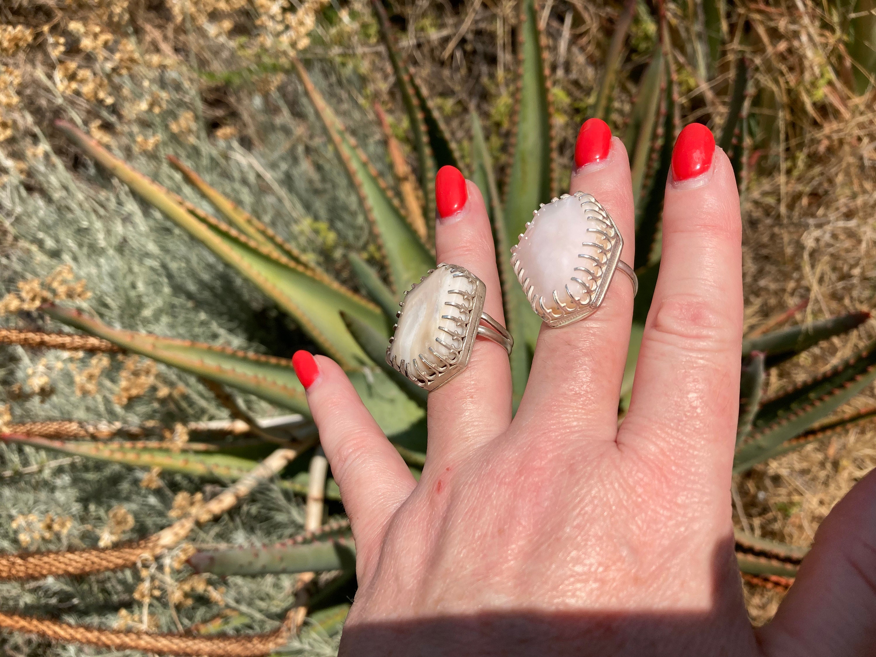 100% Hand made. One of a kind. Heavy sterling silver hand made ring setting with natural 34.70 ct pale pink opal in a semi-rough natural free-form shape. Set stone measures approximately 30mm x 20mm. American size 7.Watch my process on Instagram @sarapancakesjewelry